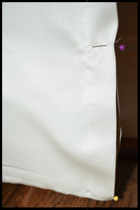 Measure your curtain from a hanging position on your installed curtain rod. Gently tug at your curtain to where you wish for your curtains to fall and pin to your desired length. In this picture the curtain is measured all the way to the floor, just touching it. If you want to see a preview of how the curtain length will look without the extra fabric pooling at the floor, fold the extra fabric back and pin (example in 3rd picture).